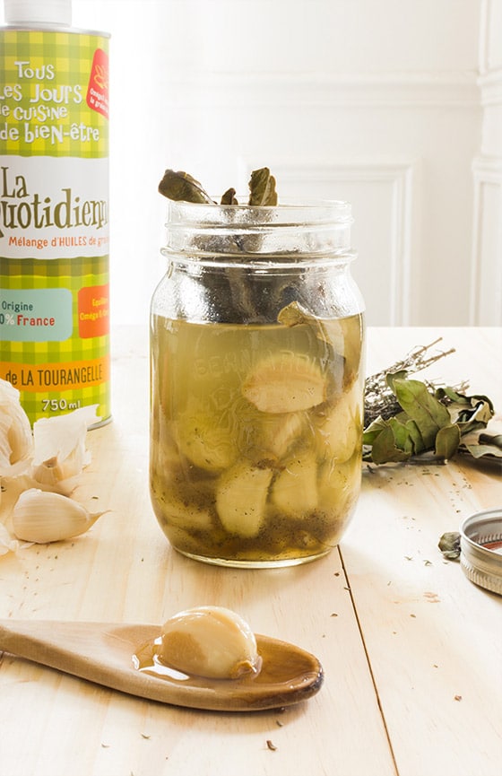 Je n'ai pas trouvé de romarin frais mais j'aurai adoré en mettre alors, n'hésitez pas si vous en avez ! Pour les herbes, mieux vaut les utiliser fraîches sinon cela trouble l'huile comme ça a été le cas chez moi. N'hésitez pas à varier les herbes utilisées pour donner des saveurs différentes !