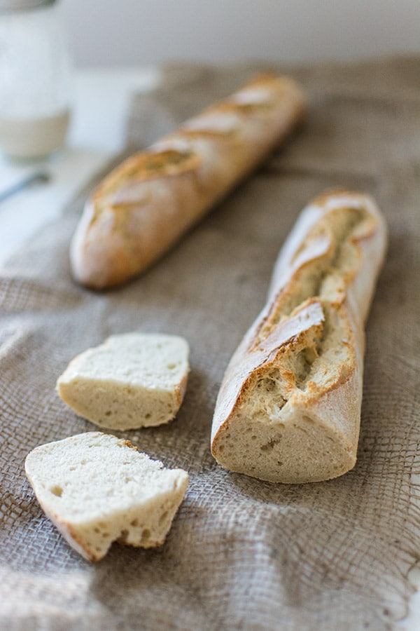 Faites bouillir 20cl d’eau. Déposez vos baguettes sur un moule ou une plaque allant au four recouverte de papier sulfurisé. Farinez le dessus de chaque baguette et à l’aide d’un couteau ou d’une incisette, réalisez de petites incisions sur le dessus de votre pain. Enfournez immédiatement vos baguettes et versez l’eau bouillante sur la plaque qui a chauffé avec votre four. Fermez aussitôt et laissez cuire 20 à 25 minutes. Vos baguettes sont cuites lorsque ça sonne creux lorsque vous toquez le dessous de vos baguettes !
