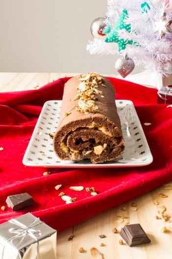 Je n’aime pas trop les bûches mais je souhaitait tout de même vous proposer une recette simple et gourmande. J’ai adapté une recette trouvée chez Nestlé Dessert et le résultat a plu à tous mes invités ! Je vous conseille par contre de servir cette bûche avec une boule de glace vanille (recette ici) ce qui permet, à la fin d’un long repas, de mieux apprécier les desserts pâtissiers.