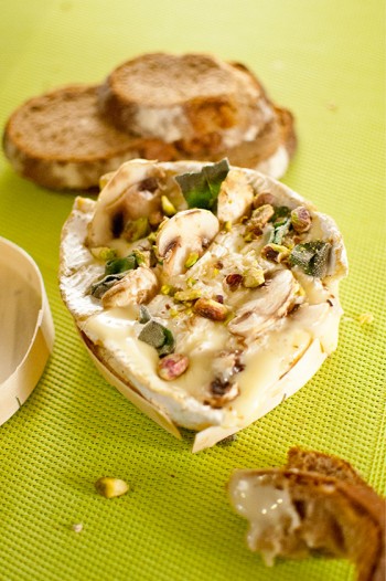 Lavez et essuyez les champignons, coupez-les en fines lamelles. Garnissez le camembert et les incisions avec les champignons, le vin blanc, la sauge et le miel. Concassez les pistaches et recouvrez-en le camembert.