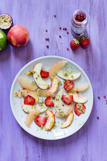 Récupérez le jus et les graines du fruit de la passion, mélangez-les si vous le souhaitez à du vinaigre de framboise et versez délicatement sur chaque assiette pour assaisonner. Recouvrez d'un peu de zeste de citron vert. Écrasez le poivre rose et parsemez-en les assiettes. Servez immédiatement.