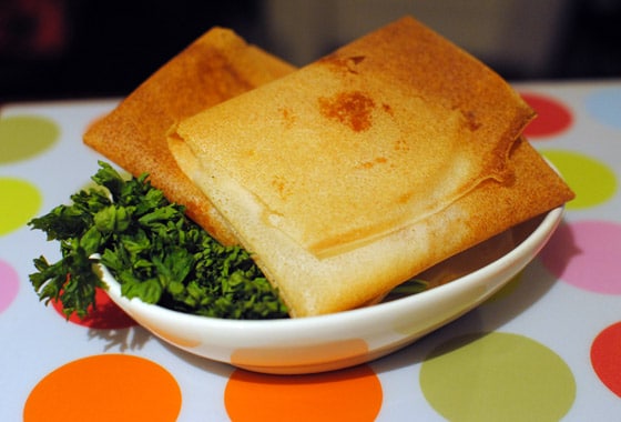 Il me restait des feuilles de brick depuis la recette des Beurek arméniens. N’ayant plus grand chose dans le frigo, j’ai tenté une petite entrée …