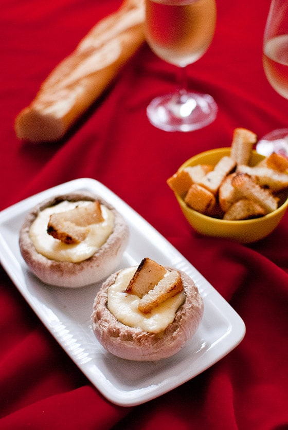 Fondue savoyarde dans des chapeaux de champignons de Paris, croutons aillés
