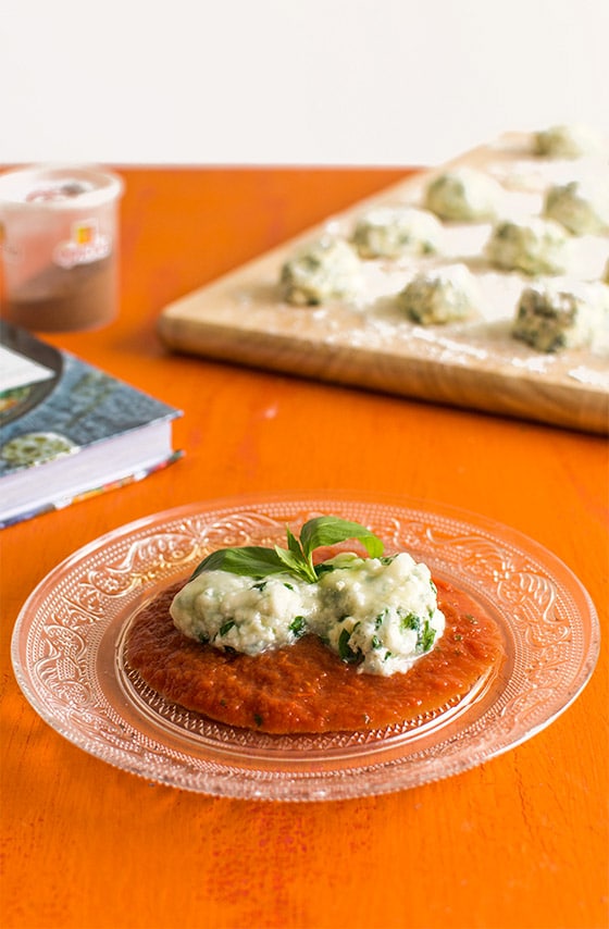 Réchauffez votre sauce tomate façon passata, déposez-la au fond des assiettes puis déposez les gnudis dessus. Servez aussitôt !
