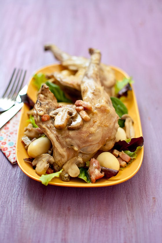 Comme vous le savez… je ne suis pas très « viande », et encore moins lapin ! Quand j’ai réalisé cette recette pour le site Champignonidee.fr, je vous avoue n’avoir pas pu la goûter. J’ai donc invité du monde à la maison et ils ont été ravis de tester cette recette, qui a remporté tous les suffrages ! Elle est idéale pour les plats familiaux du dimanche lorsque les températures sont un peu basses… N’ayant pas de cocotte, j’ai réalisé cette recette dans un grand wok mais n’hésitez pas à sortir la cocotte en fonte ou même la cocotte minute !