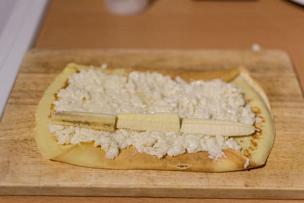 Quand vos crêpes sont froides : étalez une crêpe sur votre plan de travail. Rabattez les côtés de la crêpe pour obtenir une sorte de rectangle. Tartinez de riz au lait (comme sur la photo). Coupez des bâtonnets de banane et déposez-les sur le riz (sur le côté le plus devant vous). Roulez la crêpe sur elle-même pour former votre rouleau. Coupez des petits tronçons pour former vos "makis".