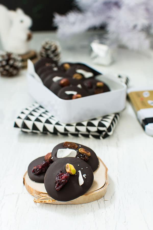 Rapide à réaliser, vous n’êtes pas obligés de suivre la méthode de tempérage du chocolat pour réaliser ces mendiants. Si vous ne réalisez pas le tempérage, vos chocolats seront bons mais un peu moins jolis.
