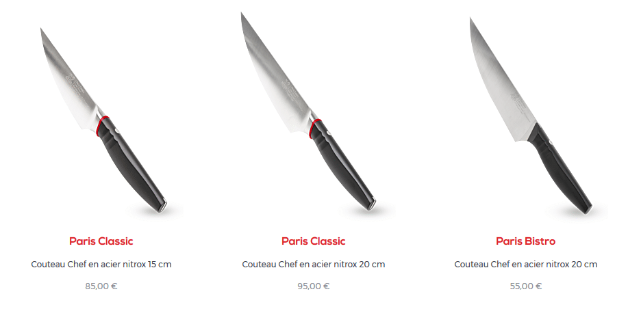 Avec une gamme allant de 55€ à 95€, les prix sont abordables pour ces couteaux de qualité en acier nitrox. Ces couteaux bénéficient également d’une garantie de 5 ans pour les Paris Bistro, et d’une garantie sans limitation de durée pour les couteaux Paris Classic, ce qui vous permet de les éprouver très largement !