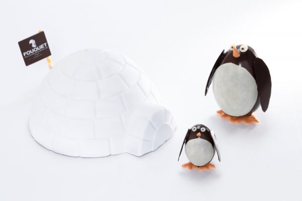 Mon coup de cœur : la banquise. Une scénette de sujets en chocolat livré en coffret de fête représentant des pinguins et leur igloo. Pour plaire aux petits comme aux grands !