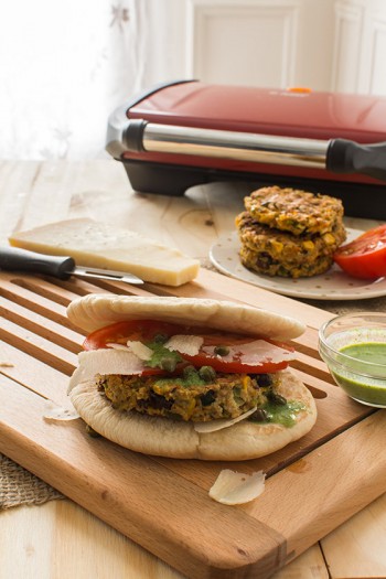 Vous avez de la chance, j’ai utilisé ce grill pour cuire les steaks végétariens qui composent ce sandwich, ainsi que le sandwich en lui-même. Il est pratique et très facile à nettoyer. Sa forme vous permet également de cuire des aliments en éliminant le gras qui s’y trouve par un système d’écoulement.