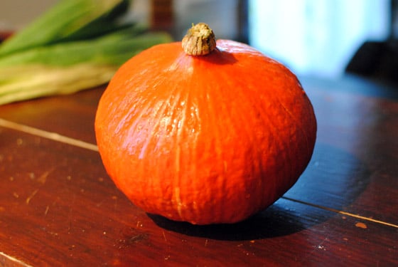 Je m’occupe du potimarron : je le nettoie et le brosse légèrement pour enlever toute trace de terre. J’épluche les parties de la peau qui présentent des saletés. Je conserve le restant.