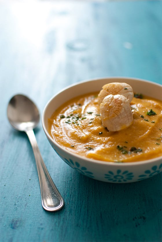 Cette recette est née du fin fond de mon frigo… Il me restait du potiron surgelé en cubes, et une boîte de cœurs d’artichauts et quelques Saint-Jacques surgelées… Je vous avoue avoir tenté un peu les choses au hasard et finalement j’ai été surprise de l’originalité des saveurs et de leur association. Bref, je vous recommande vivement le mélange potiron/artichaut !